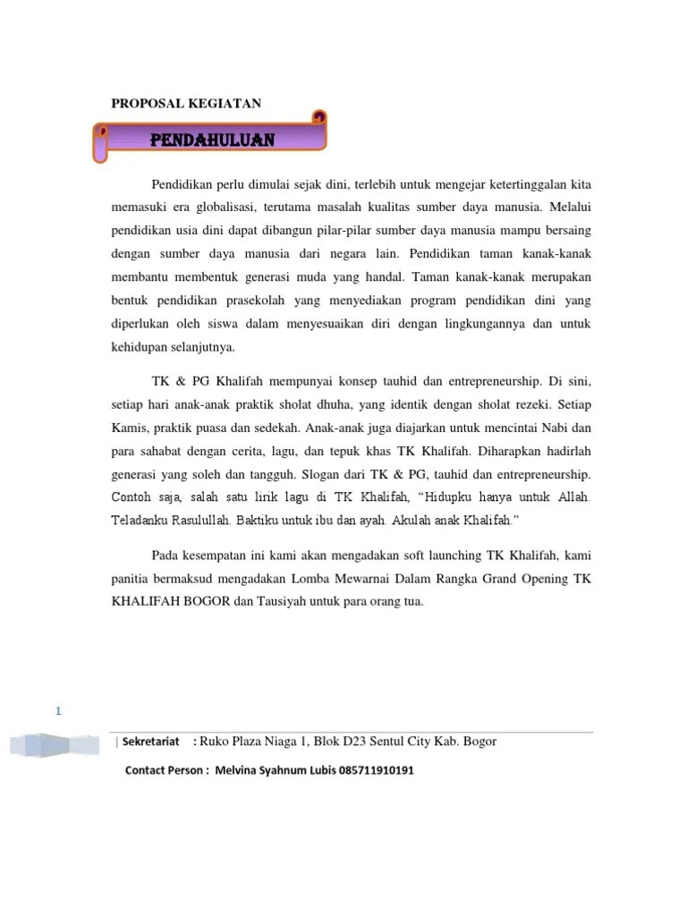 Misalnya untuk peringatan ulang tahun sekolah, proposal digunakan untuk mengajukan izin kegiatan kepada kepala sekolah. Untuk mencapai visi dan misi tk dan sekolah mutiara menggembangkan aktivitas. Peserta didik dalam kegiatan lomba mhq tingkat nasional 2019. Latar belakang perkembangan teknologi dan masyarakat . Pekan olah raga dan seni.